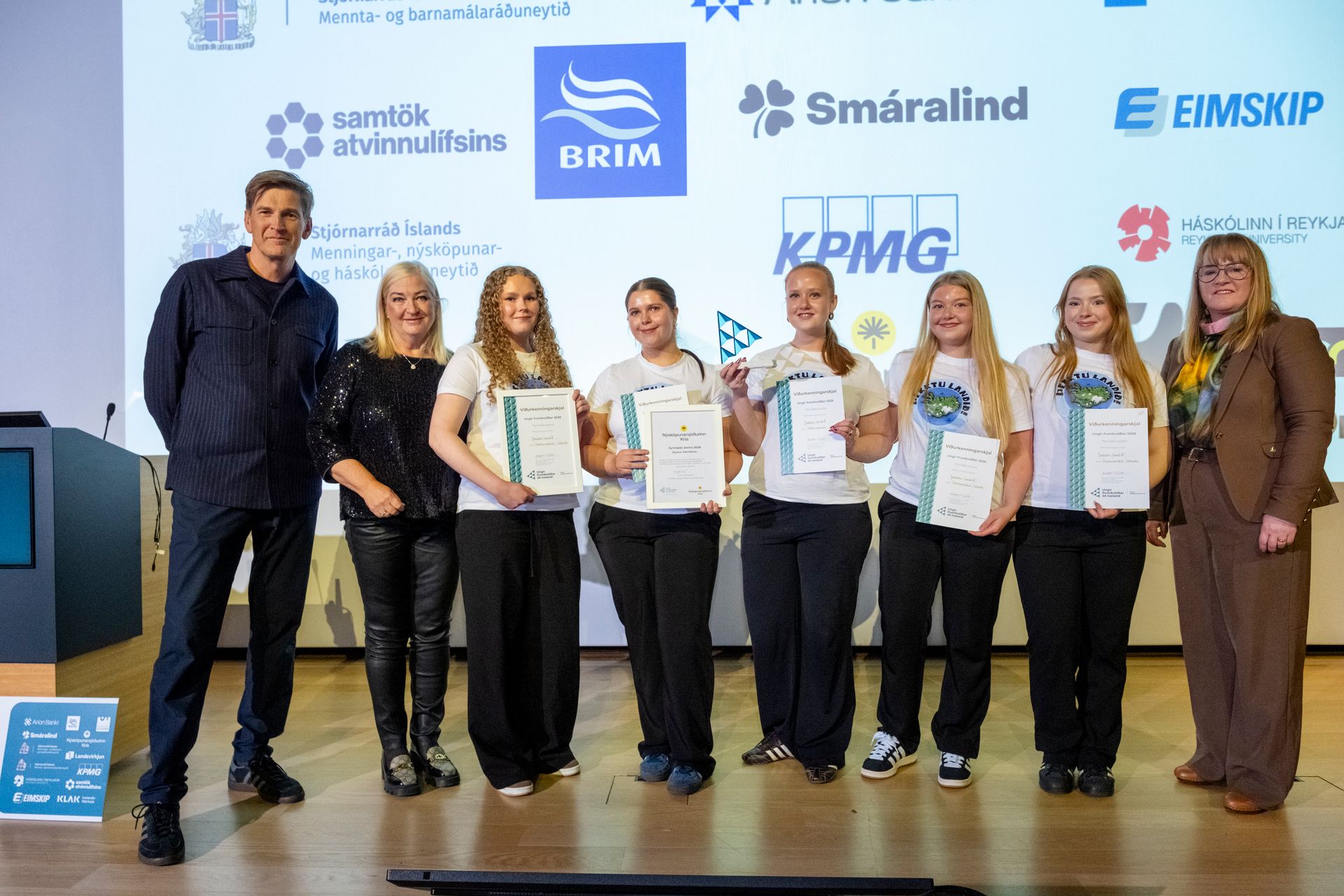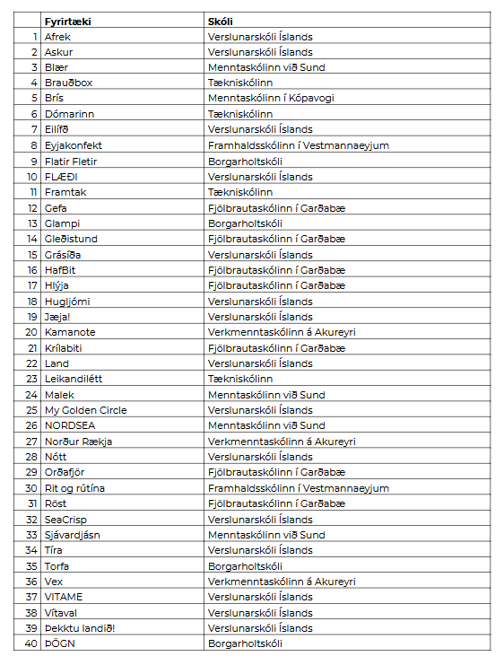 Benedikt Gíslason bankastjóri Arion banka, stjórnarformaður Ungra frumkvöðla – JA Iceland og Jóna Bjarnadóttir framkvæmdastjóri Samfélags og umhverfis hjá Landsvirkjun og stjórnarmaður í Ungum frumkvöðlum – JA Iceland veittu verðlaun og viðurkenningar til eftirfarandi fyrirtækja: · Fyrirtæki ársins – Urri, Menntaskólinn við Sund · Fyrirtæki ársins 2. Sæti – Hjartaborg, Verslunarskóli Íslands · Fyrirtæki ársins 3. Sæti – Rs. Snúður, Menntaskólinn við Hamrahlíð · Frumlegasti sölubásinn – Smáralind – Marín, Menntaskólinn við Sund · Öflugasta sölustarfið – Smáralind – Urri, Menntaskólinn við Sund · Áhugaverðasta nýsköpunin – Þörungurinn, Verslunarskóli Íslands · Samfélagsleg nýsköpun – Tilfinningaeyjan, Verslunarskóli Íslands · Áhugaverðasta fjármálalausnin - Mynta, Fjölbrautaskólinn í Garðabæ · Besti sjó-bissnessinn – Atlas, Verslunarskóli Íslands · Matvælafyrirtæki ársins – Berjabiti, Menntaskólinn við Sund · Besta hönnunin – Andrúm, Tækniskólinn · Áhugaverðasta tækninýjungin – SR Turning, Tækniskólinn · Umhverfisvænasta lausnin – Turnip Up, Menntaskólinn við Sund